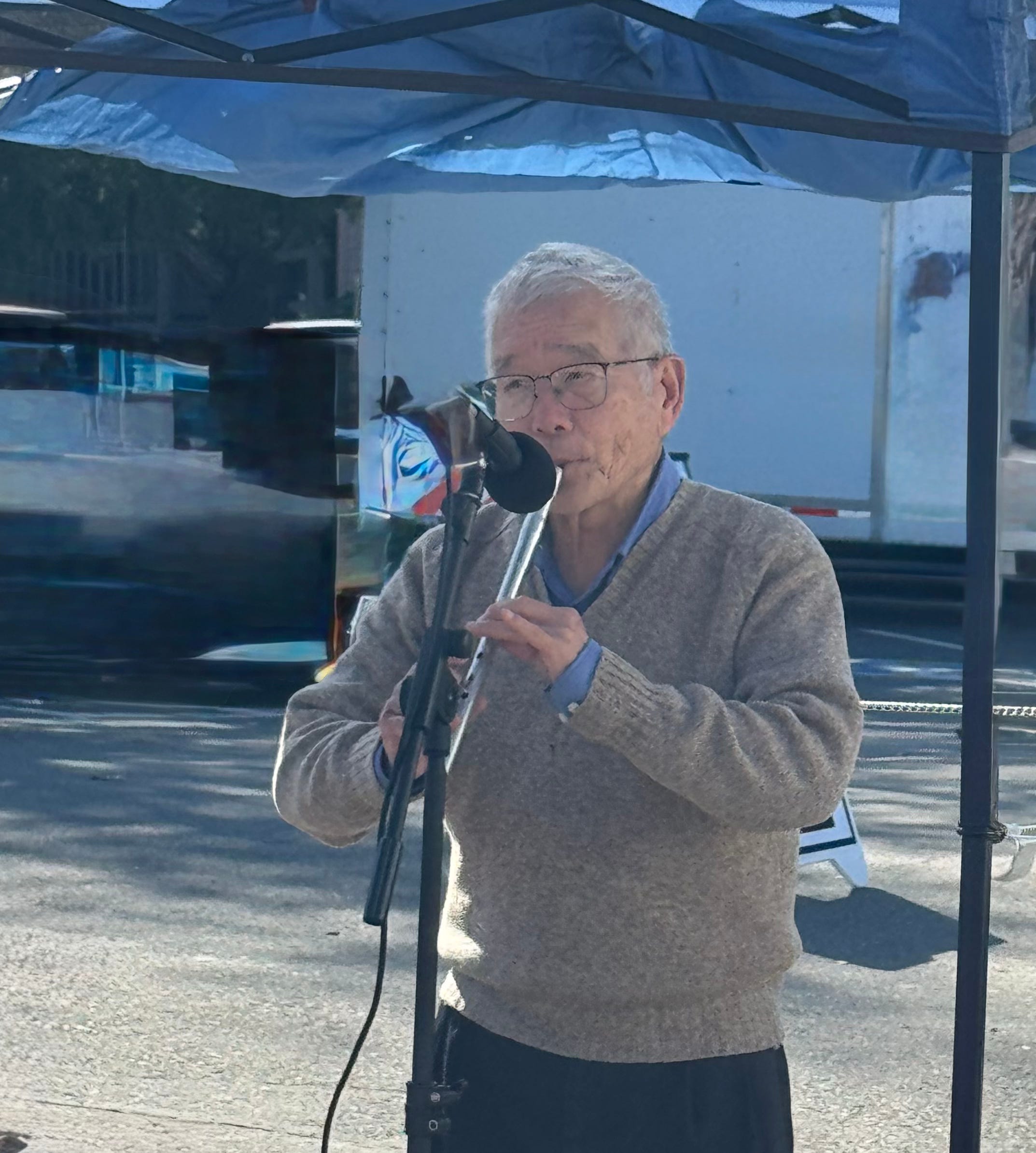 I stopped at the Pleasanton outdoor Farmer’s Market to listen to a Japanese flutist who was playing admidst the mob of passer-byers.